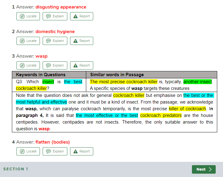 It is supported by a thorough and useful explanation consisting of supporting hints, highlighted paragraphs and sentences from where the question has been asked and location of the answers which helps in bringing the learner a step closer to a great band score.