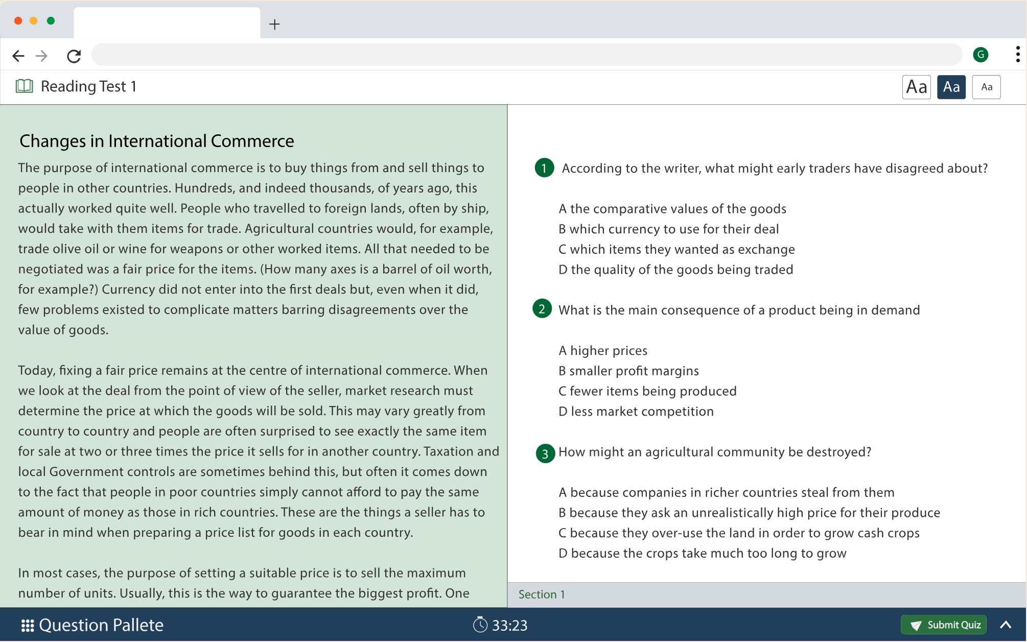 Experience a real IELTS-style reading test interface designed to match the actual exam. Built-in tools like a digital notepad help students highlight key points and take important notes while practicing.